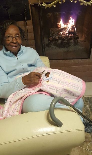 At 90 years young, Mrs. Anna Roberson is adding the final additions to a beautifully unique baby quilt. This handmade quilt is adorned with intricate details, making it a magnificent heirloom for a precious little girl to cherish for generations.